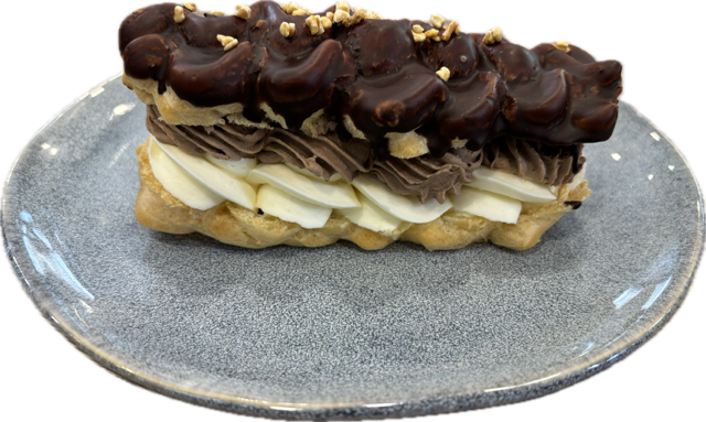 Odpalové těsto naplněné vanilkovým krémem a pařížskou šlehačkou, horní část je namočená v čokoládové polevě.