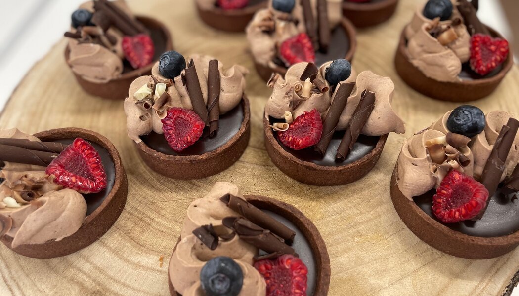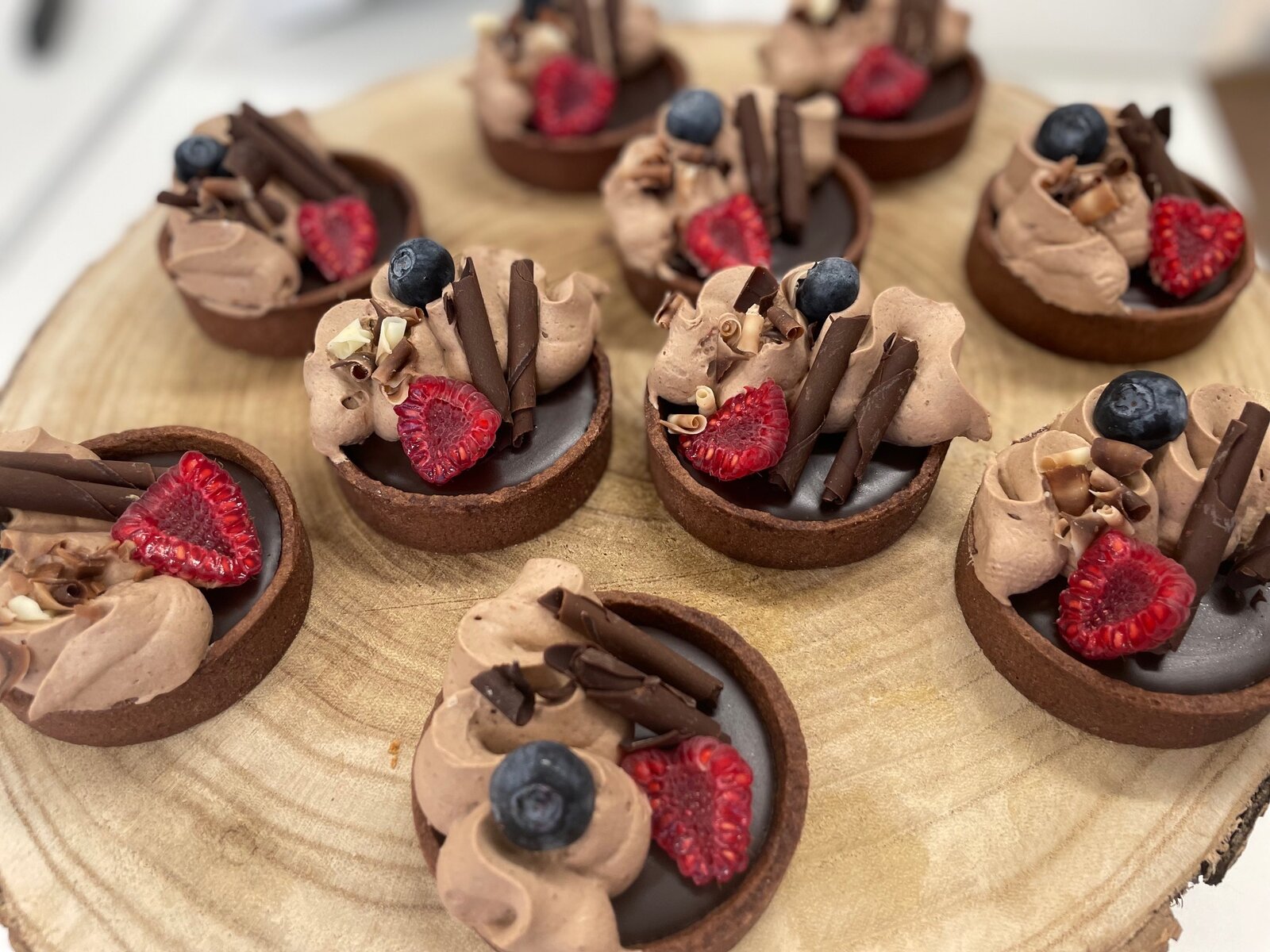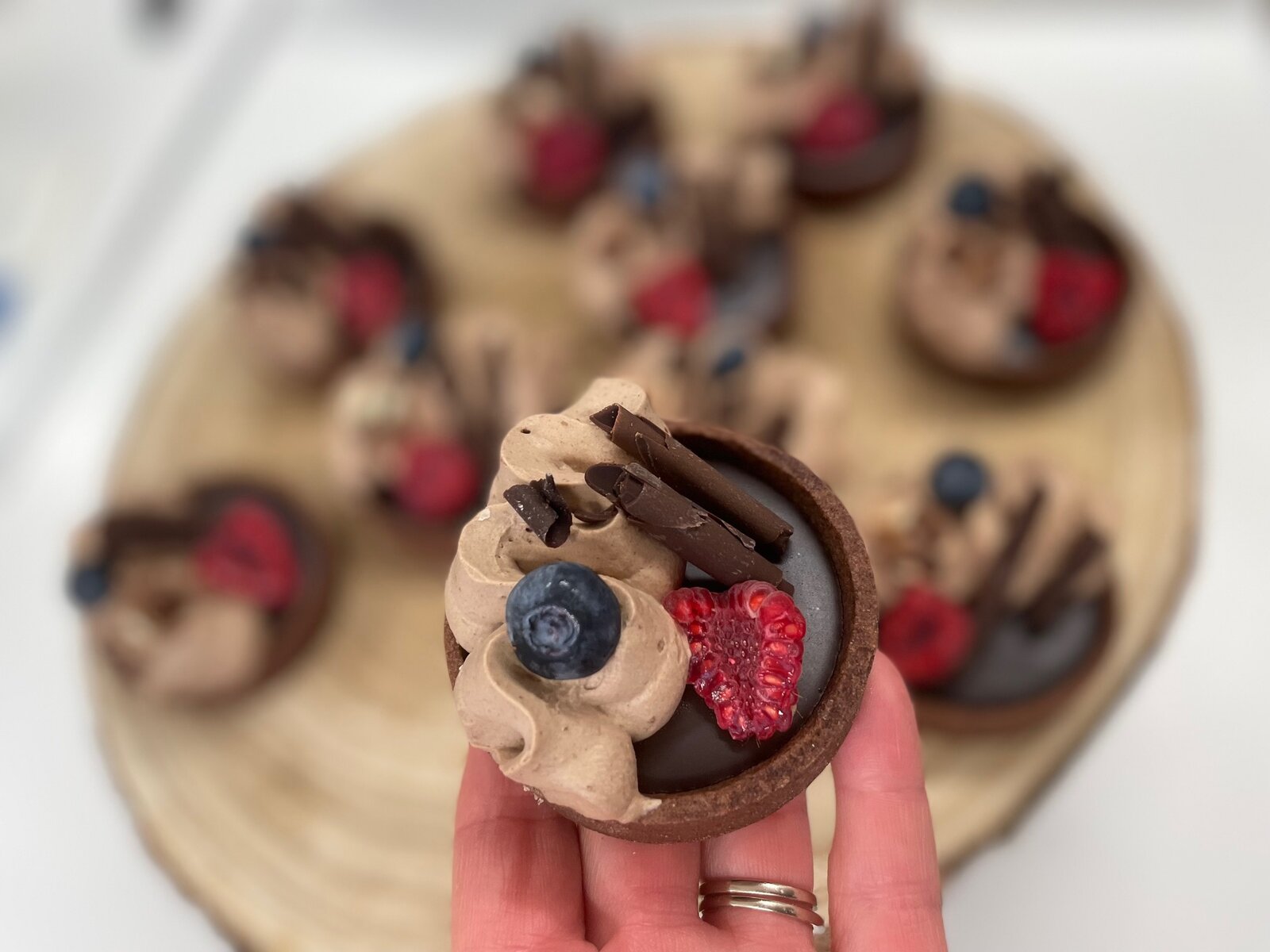 Čokoládová máslová tartaletka naplněná čokoládovou ganache a dozdobená čerstvým ovocem - dle sezony a nabídky.