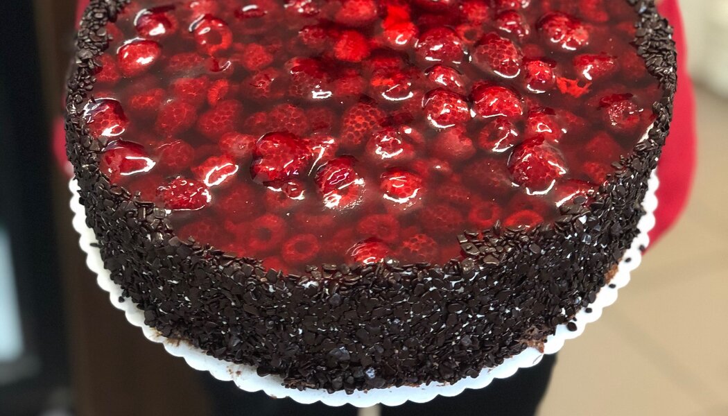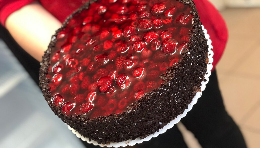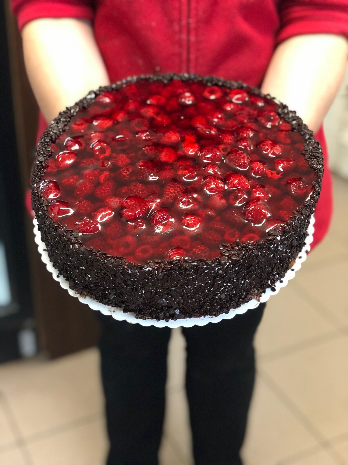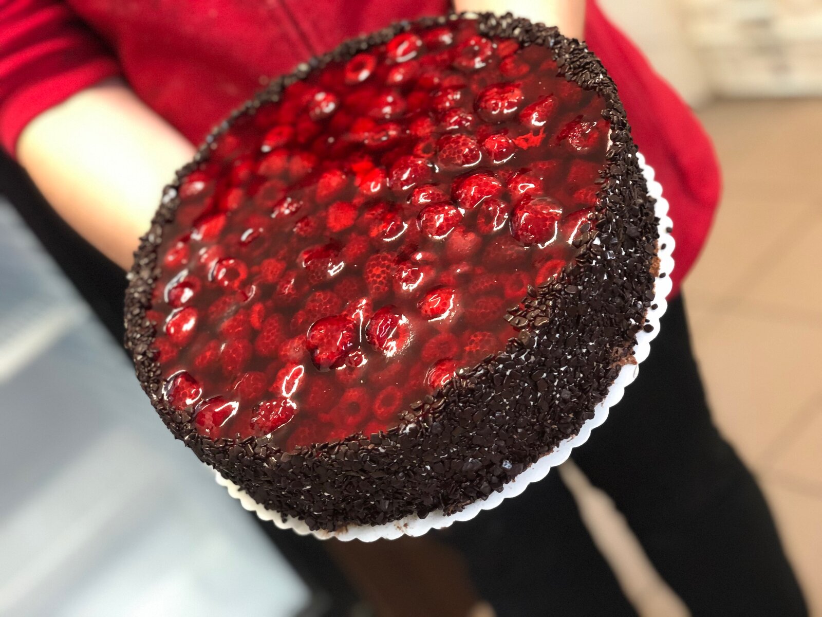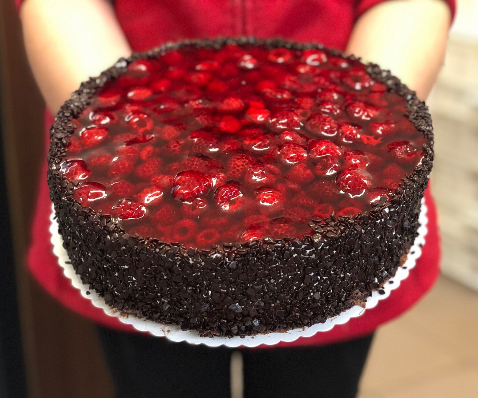 Netradiční spojení lahodného čokoládového krému se zakyasanou smetanou s osvěžující chutí šťavnatých malin si zamilujete. Maliny jsou k dezertům plným lásky přímo předurčené a tento čokoládový dort vyvolá vždycky to, co od něj očekáváte - potlesk! Nápis na dort: 50,-Kč
