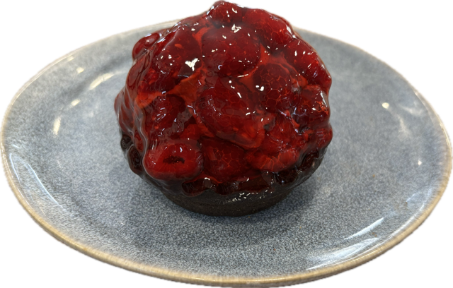 Linecká kakaová tartaletka naplněnapařížskou šlehačkou ozdobená malinami v želé.