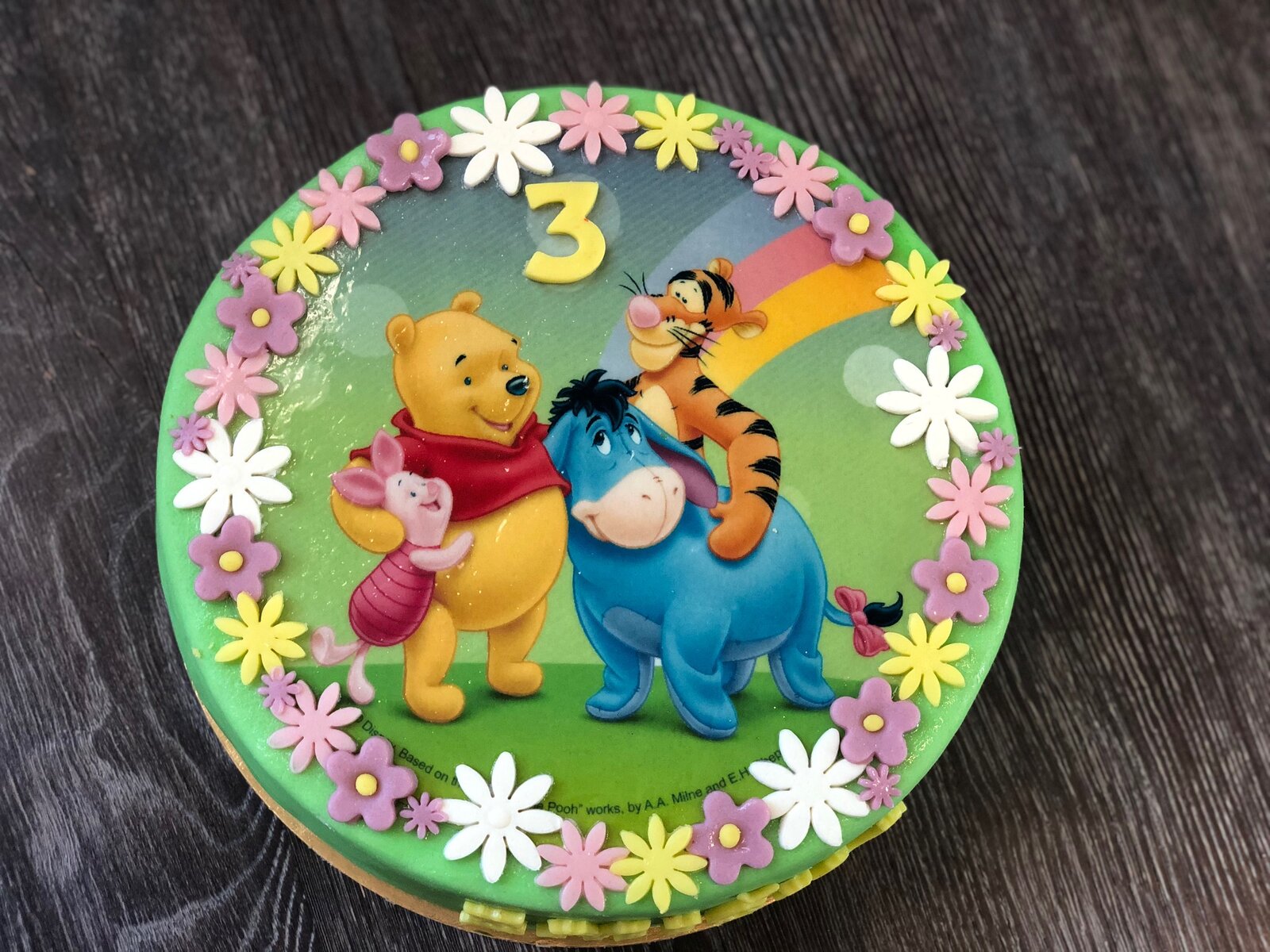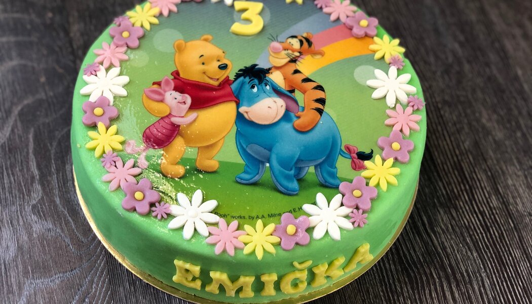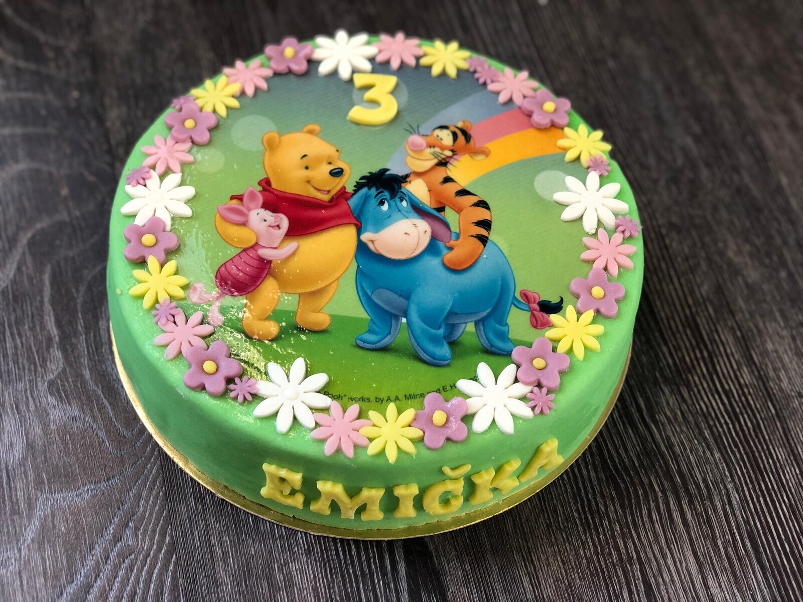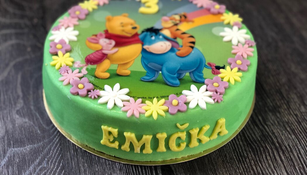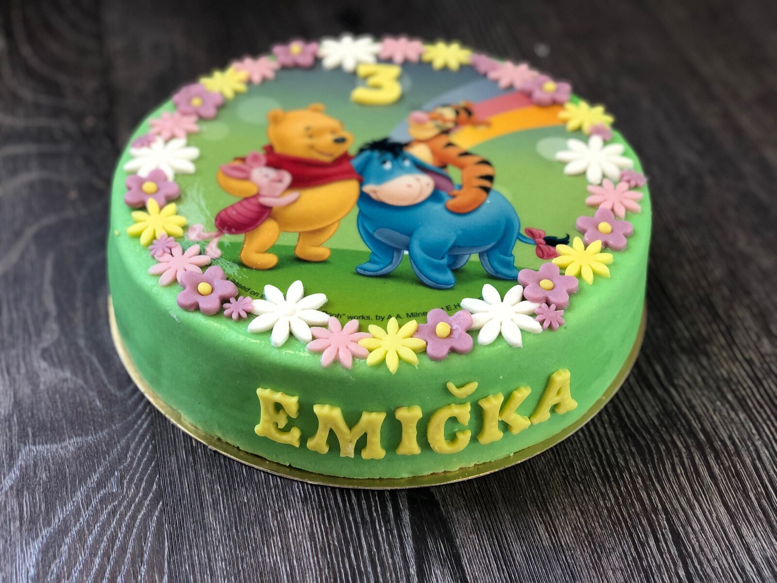 Náplň tvoří vanilkový piškot a můžete zvolit a) šlehačka se zakysanou smetanou a jahodami, b) pařížská čokoládová šlehačka. Dort je potažený a zdobený domácím mléčným marcipánem a obrázkem na jedlém papíře. Dort je možné barevně nakombinovat podle přání zákazníka. Nápis nebo číslice není problém. Velikostně dort stačí pro cca 10 lidí.