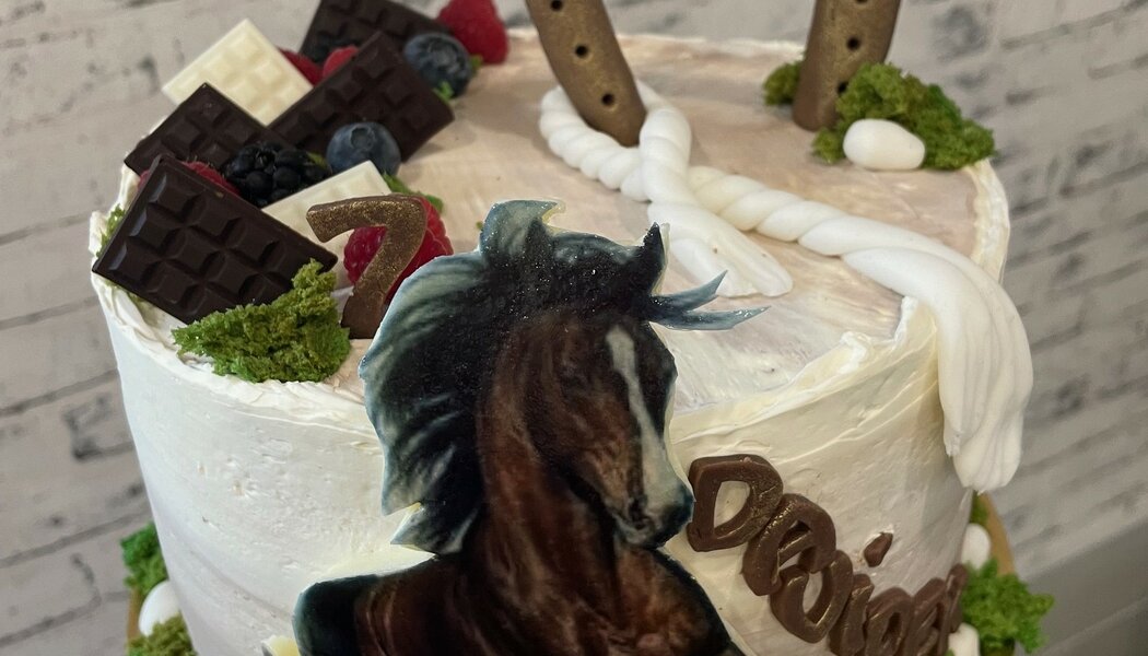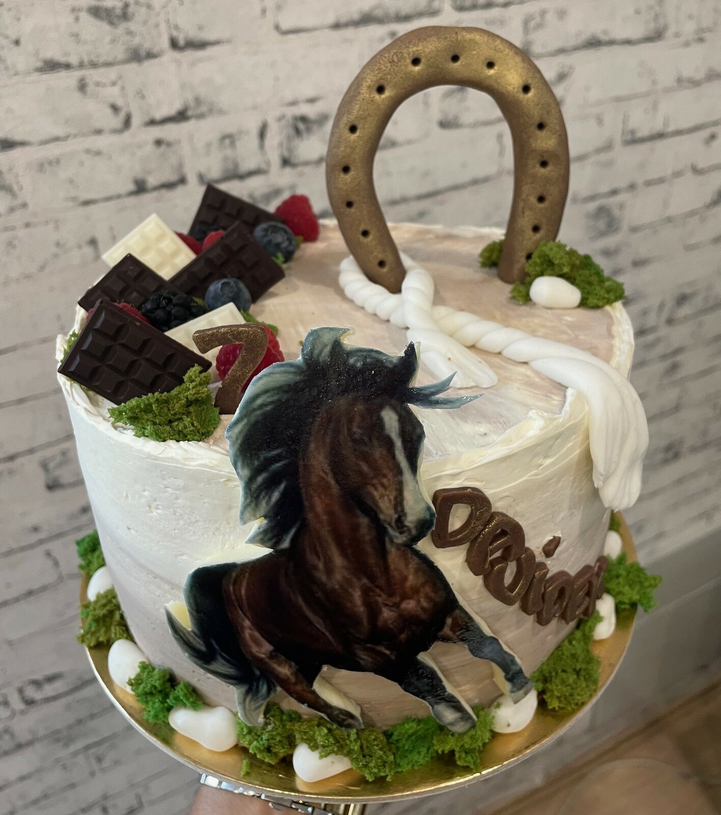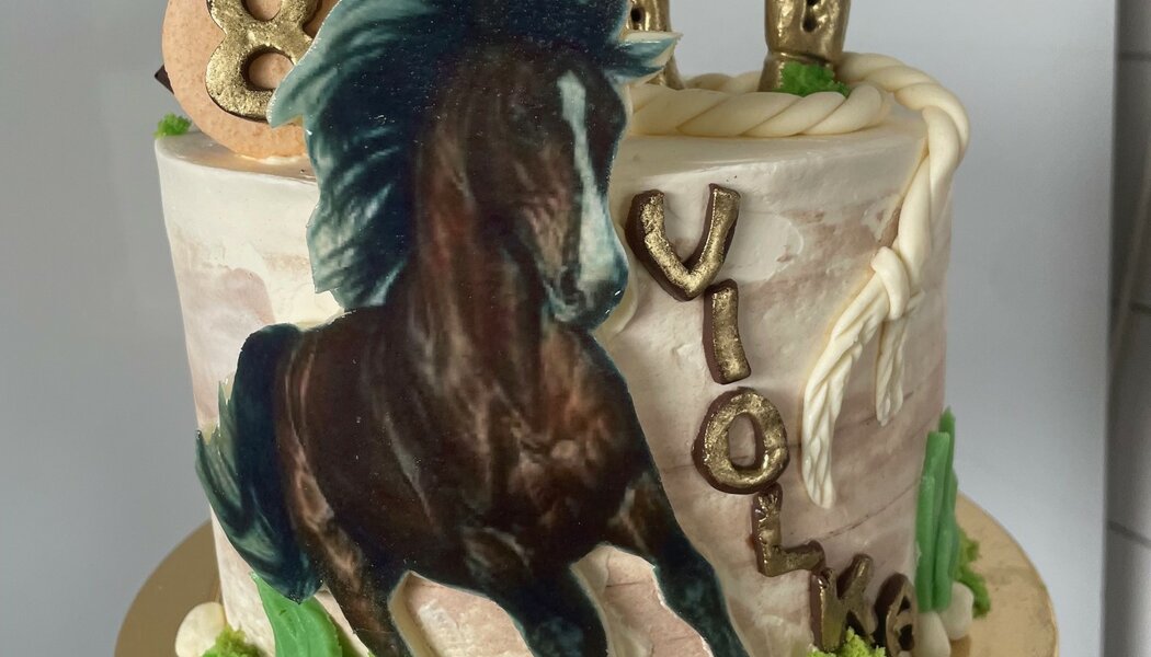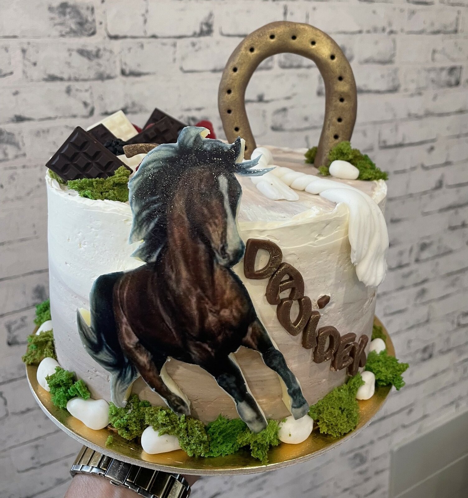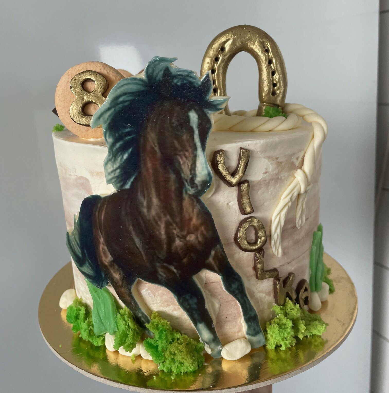 Dort s náplní dle Vašeho zadání. Zdobení dle fotografie, nápis a obrázek je možné změnit. Dort je obmazaný máslovým krémem a dozdobený jedlým obrázkem a marcipanovými ozdobami.