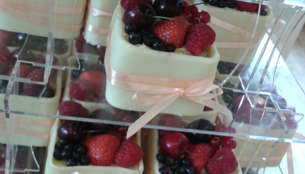 Tyto dortíky mohou být naplněny krém, který si zvolíte. Obaleny jsou marcipánem a dozdobeny čerstvým ovocem, v tomto případě mixem ovoce. Počet dortíků si určujete sami podle počtů hostů. Cena dortíků se odvíjí od celkové váhy všech dortíků, 1ks vážívá okolo 200g. Celkový vzhled a provedení dortu domluvíme osobně