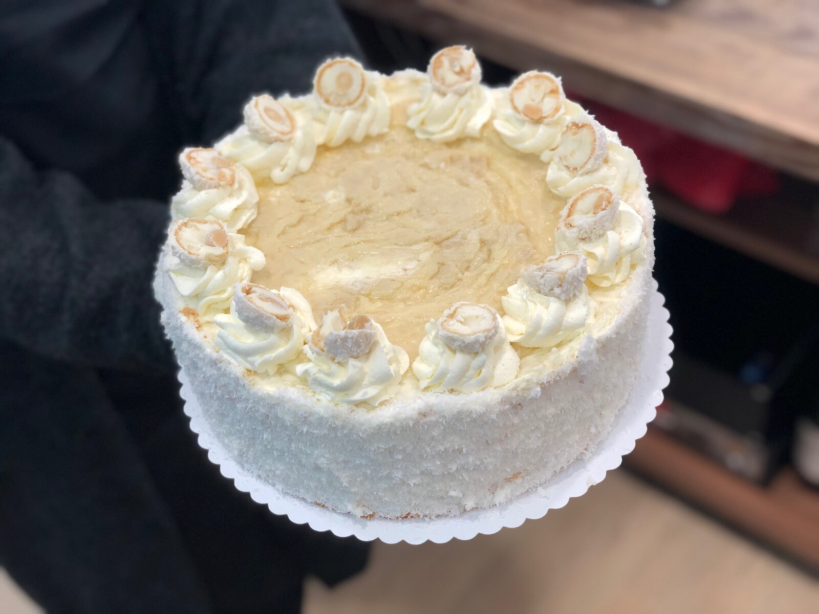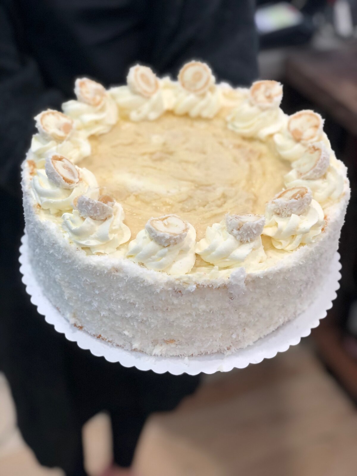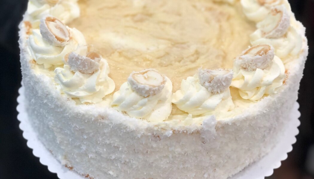 Kokosové pohlazení. Pro všechny milovníky kokosu a mandlí. Lehký, nadýchaný piškot je na třikrát promazaný kokosovou šlehačkou s kousky mandlí, celý dort je bohatě obsypaný kokosem.
