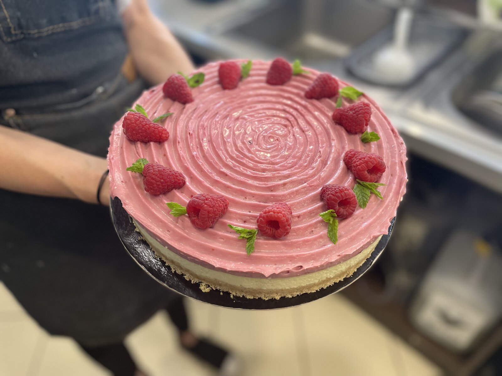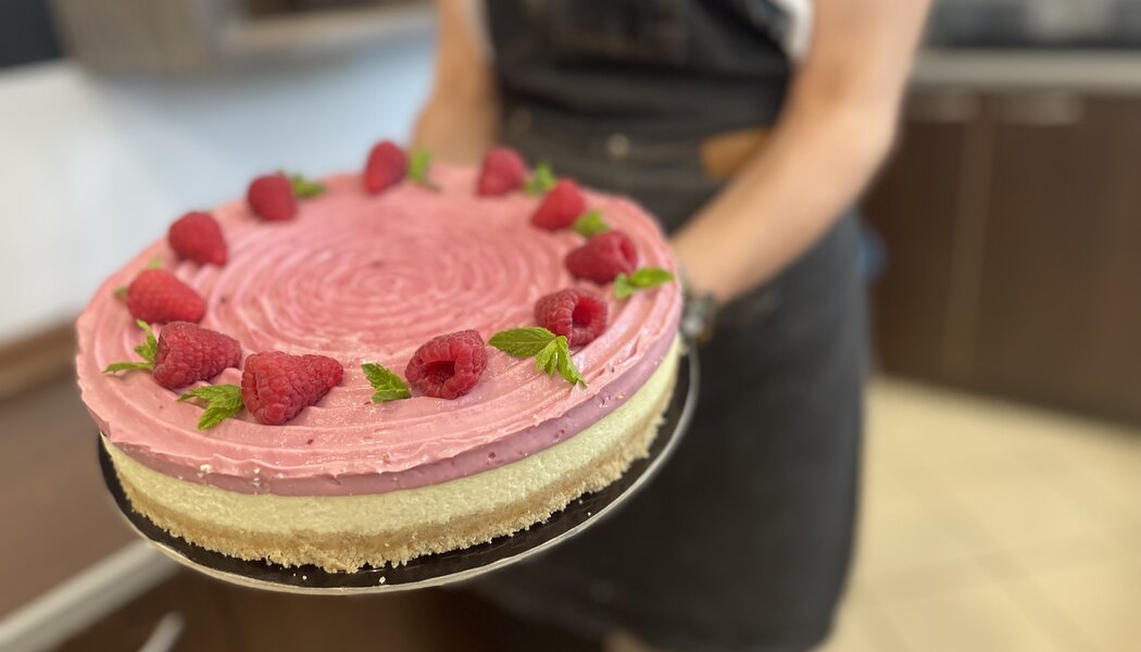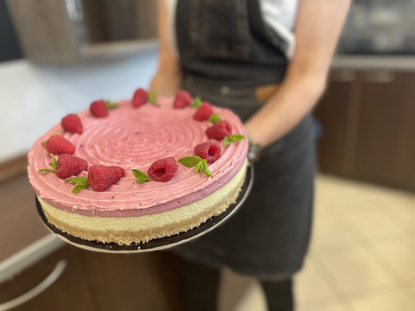 „Král mezi dezerty – poctivý New York cheesecake s hedvábnou malinovou pěnou z bílé čokolády a intenzivním malinovým pyré.“