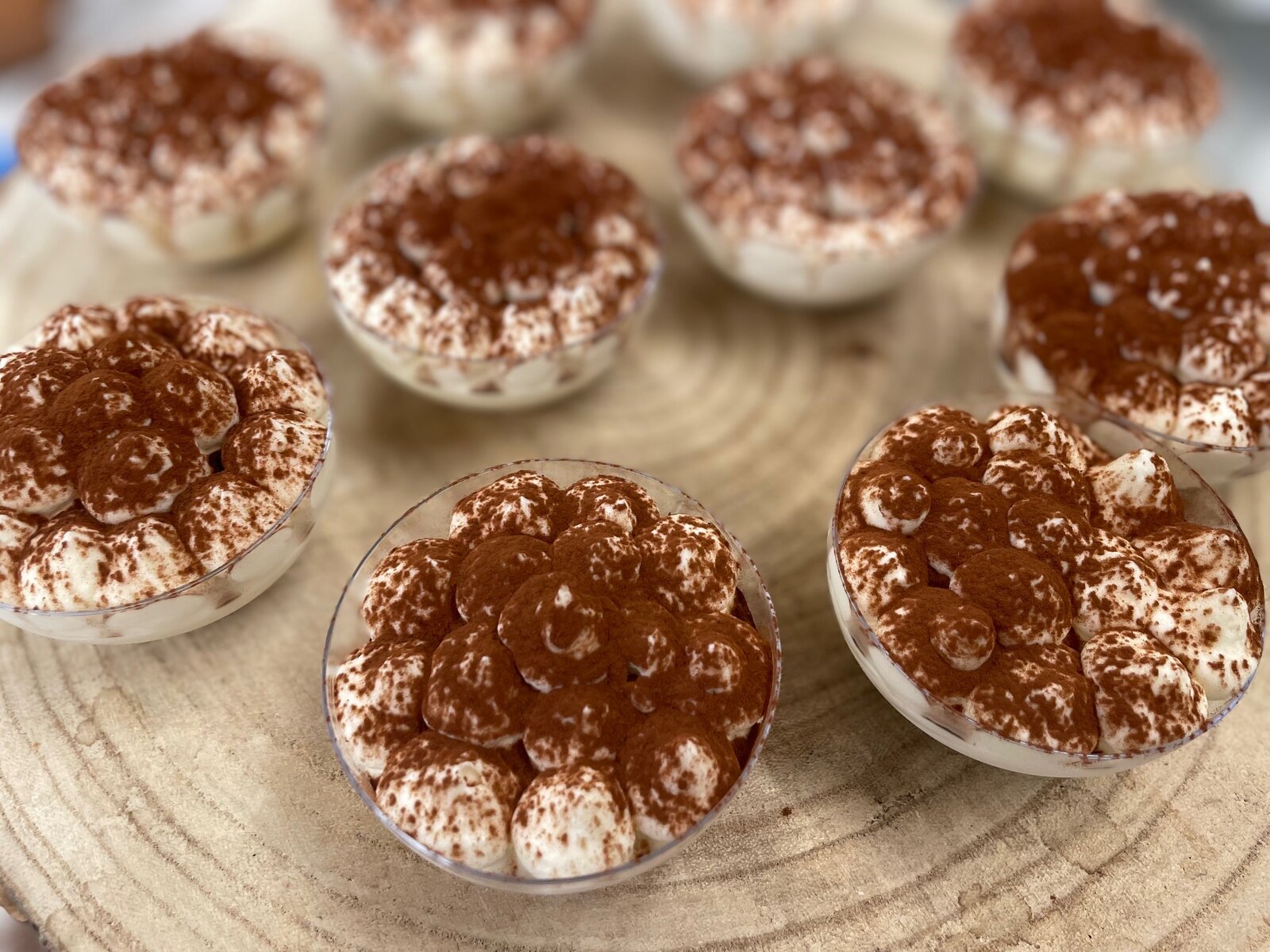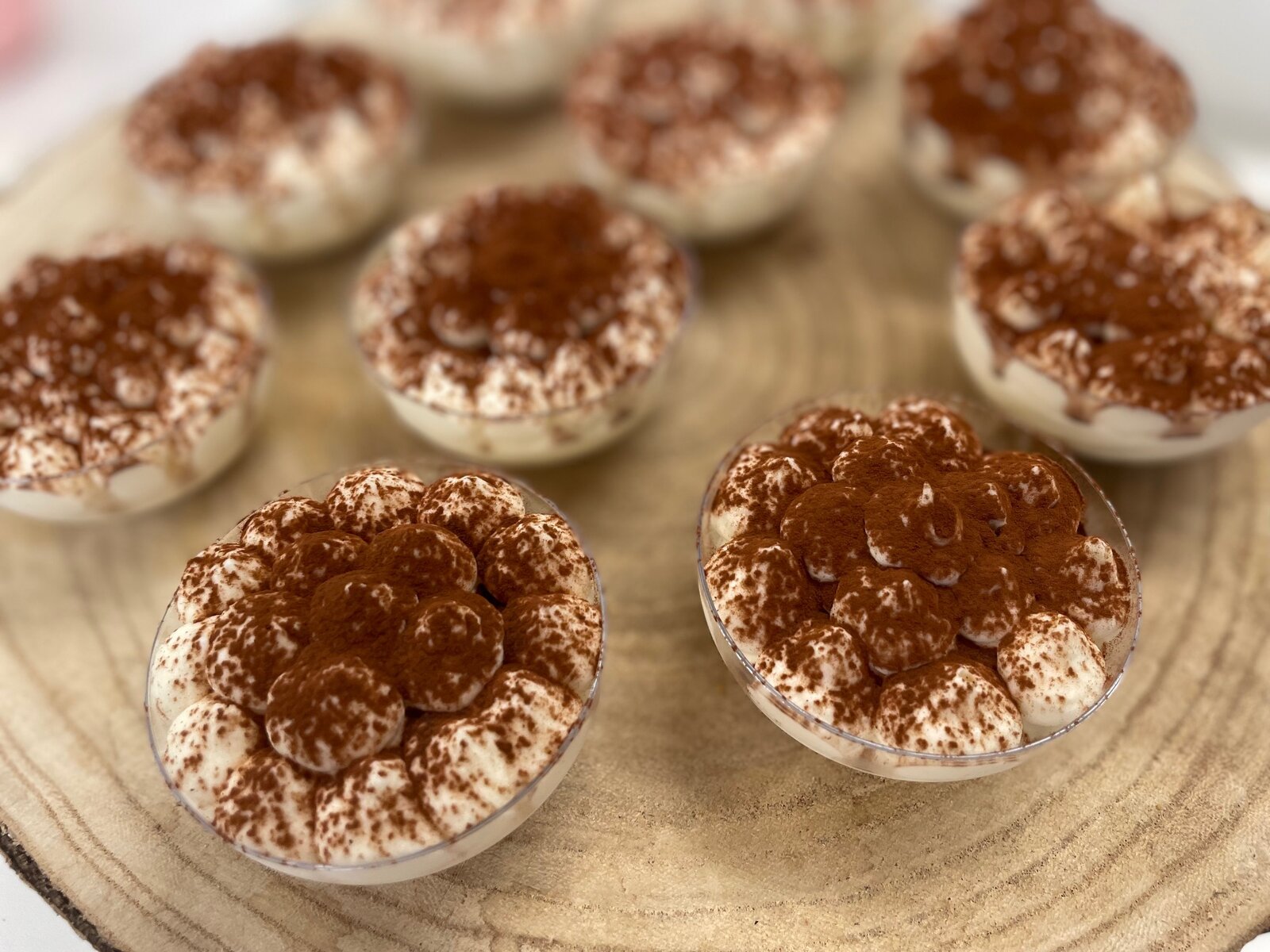 Vhodné na oslavy, svatby nebo firemní večírky. Odběr nad 20 ks, velikost kelímku 0,05l. Originální italský krém tiramisu, proložený piškotem namočeným v kávě s Amaretem