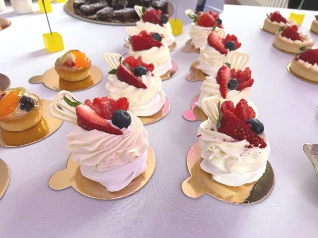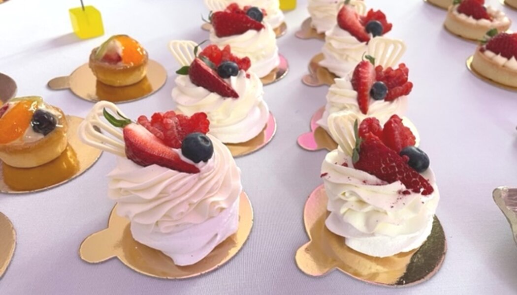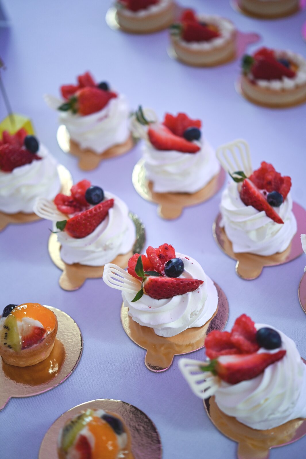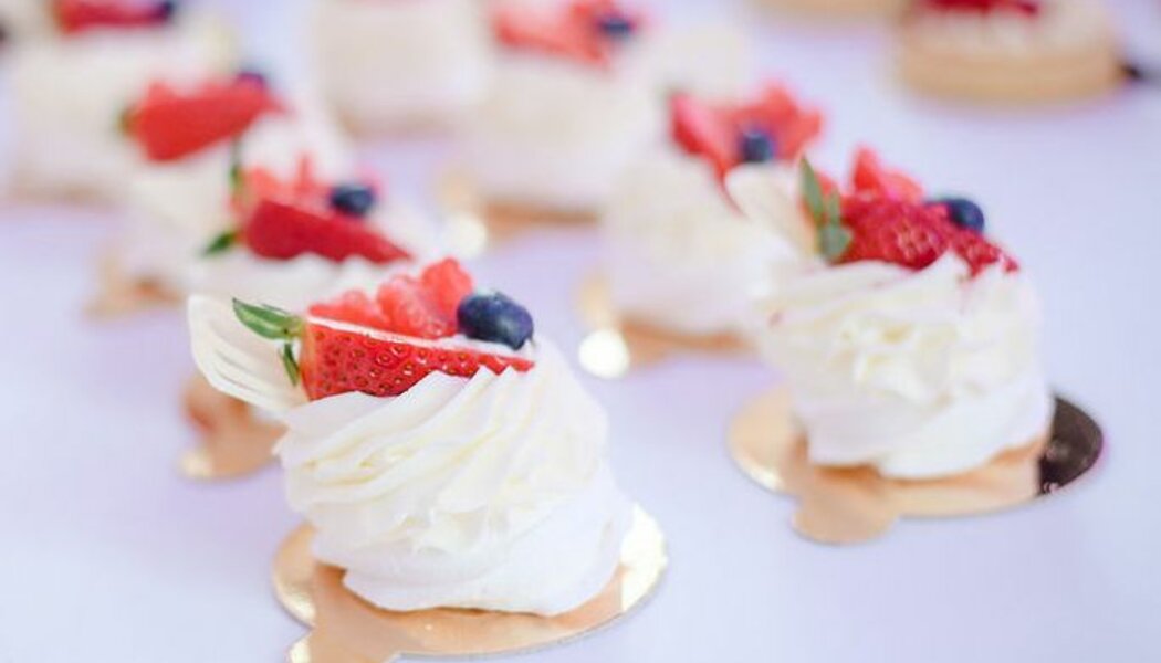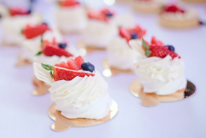 Sněhová pusinka zdobená šlehačkou a čerstvým ovocem dle sezony