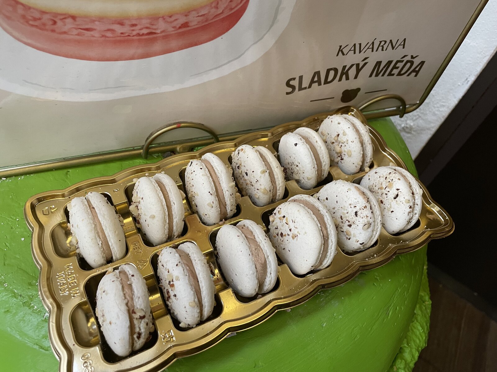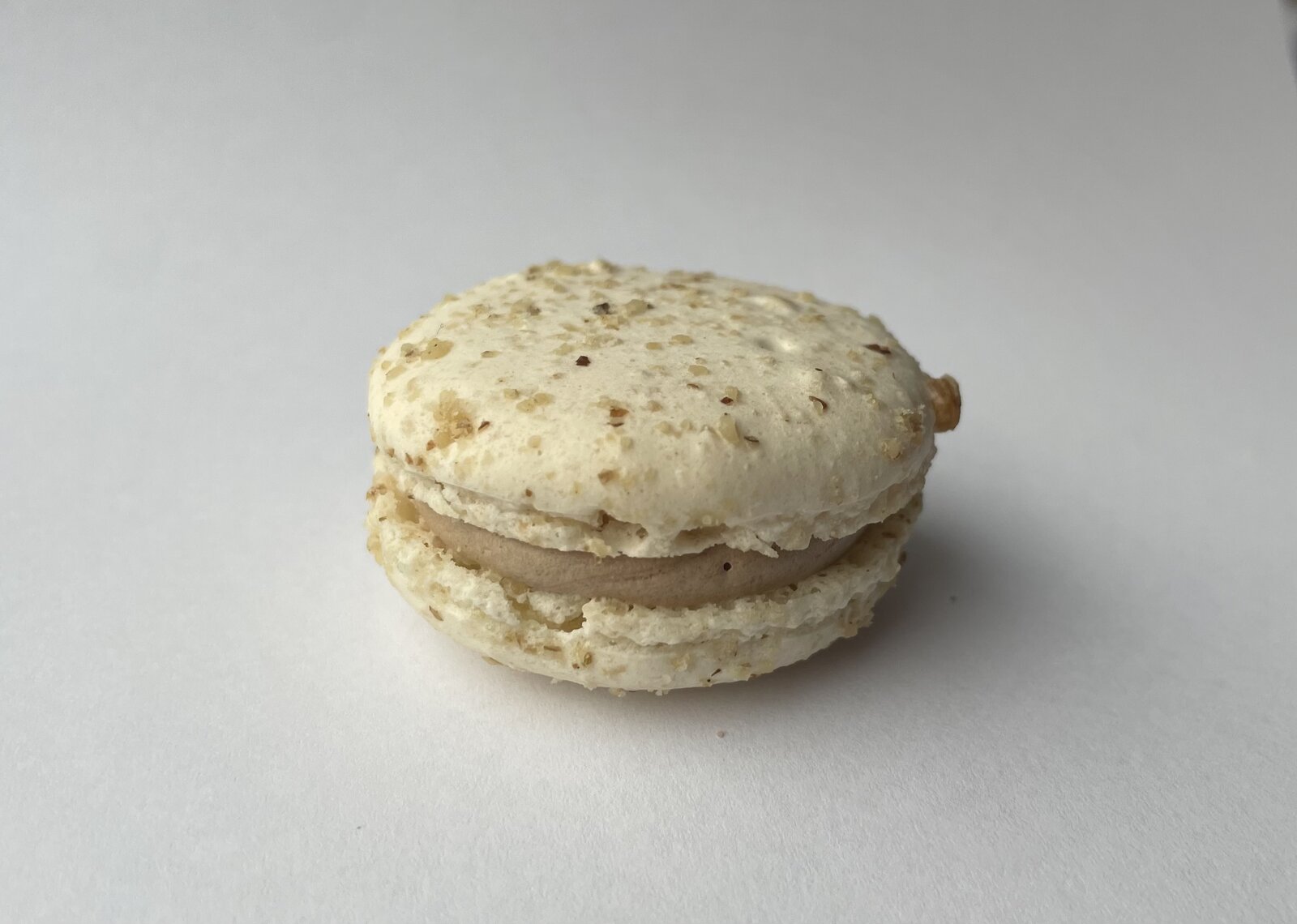 Nutellový krém, makronka posypaná oříšky.
