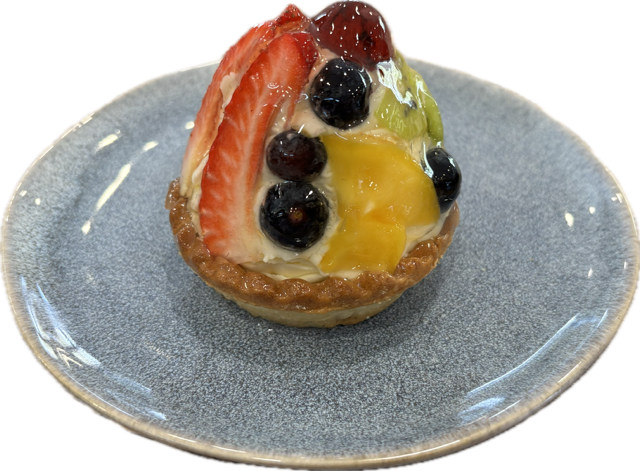 Linecká tartaletka bohatě napněná pudingovým krémem a dozdobená sezoním ovocem, které je lehce omáčené v želatině.
