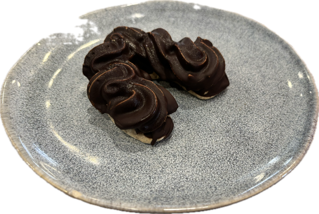 Sněhový oříškový korpus nastříkaný pařížským krémem a následně namočený v čokoládové polevě.