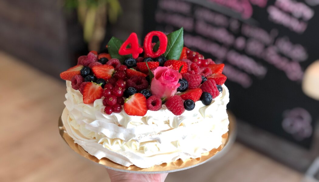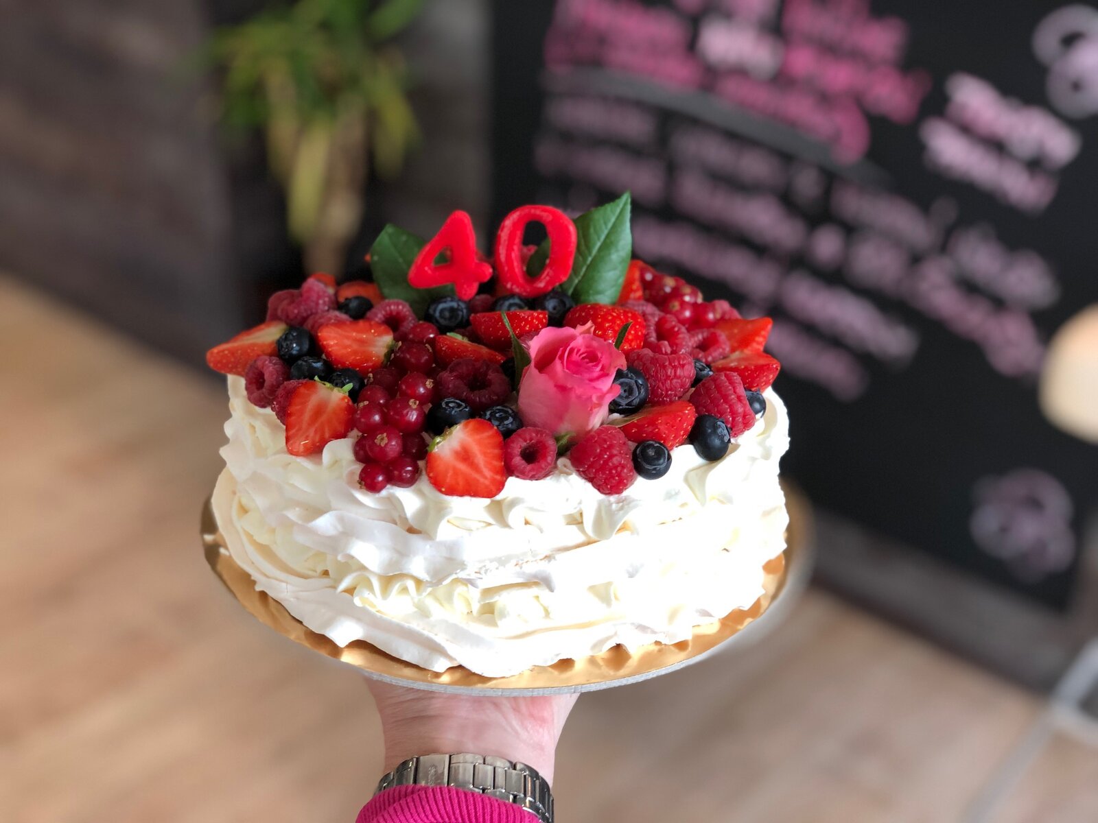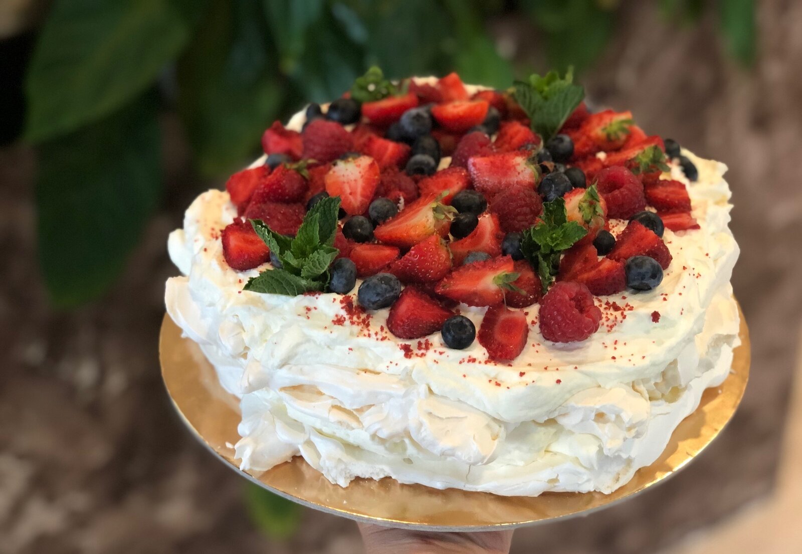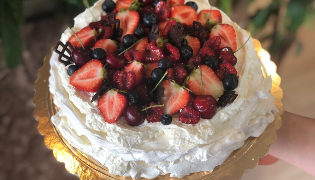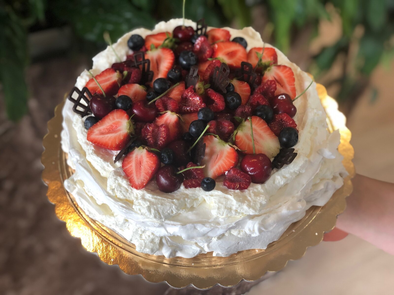 Sněhová pusinka zdobená šlehačkou a čerstvým ovocem dle sezony